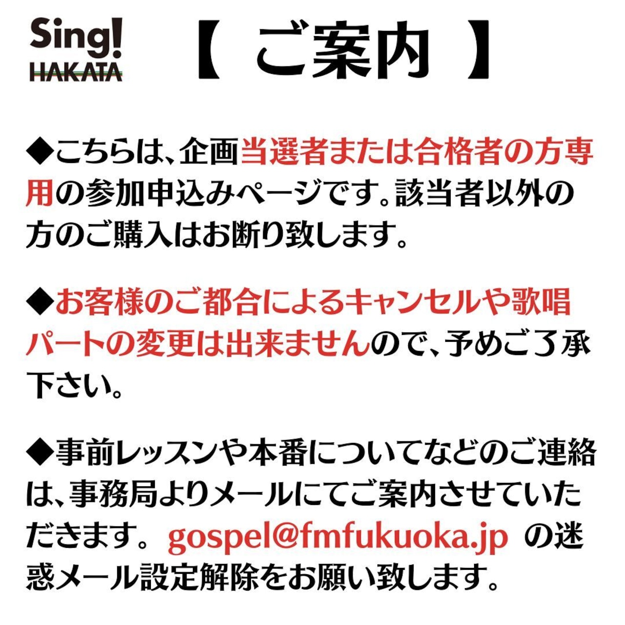 ※事前レッスンや本番についてなど、参加者の皆様へのご連絡はSing!HAKATA事務局より、直接メールにてご案内させていただきます。右記アドレス([email protected])の迷惑メール設定解除をお願いします。